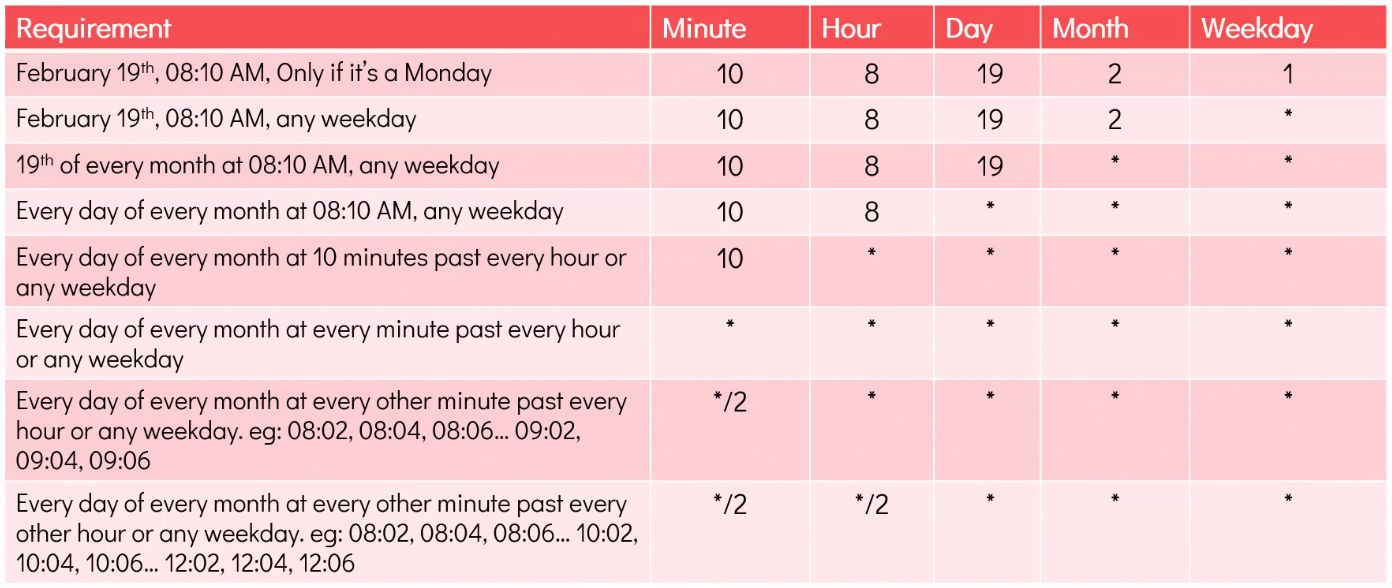 • - = range of values (i.e., 2-4) (for ex a job need to run at 2,3,4 AM)